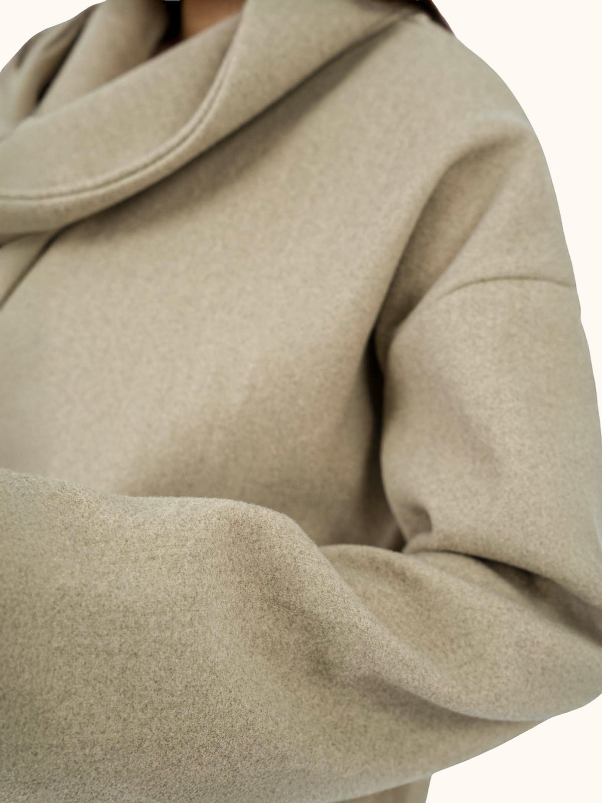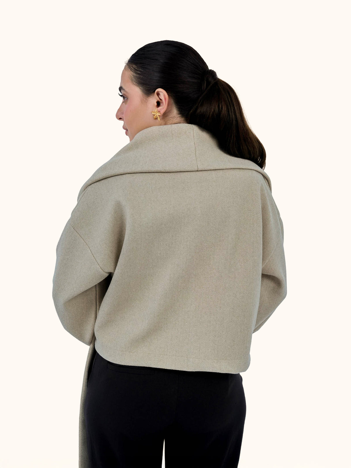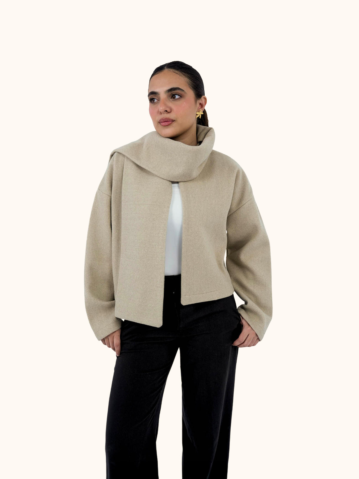 A soft cropped jacket crafted from smooth wool-felt broadcloth, designed with a relaxed, modern silhouette and a clean dropped-shoulder line. The integrated scarf detail adds a refined, elevated touch—styled loose for ease or wrapped for a sharper look.
